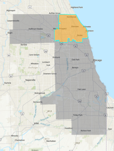 The Circuit Court of Cook County's Second Municipal District is made up of the following municipalities in the northern suburbs of Cook County: the towns of Deerfield*; Des Plaines; Evanston; Glencoe; Glenview; Golf; Kenilworth; Lincolnwood; Morton Grove; Niles; Northbrook; Northfield; Park Ridge; Skokie; Wilmette; and Winnetka; and the Townships of Evanston, Maine, excluding that part of the Township of Maine within the territorial limits of the municipality of Rosemont, New Trier, Niles, Northfield, excluding that part of the Township of Northfield within the territorial limits of the municipality of Prospect Heights, and that part of the Township of Wheeling within the territorial limits of the municipality of Des Plaines.