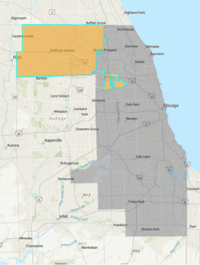 The Circuit Court of Cook County's Third Municipal District is made up of the following municipalities in the north western suburbs of Cook County: the municipalities of Arlington Heights; Barrington*; Barrington Hills*; Bartlett*; Bensenville*; Buffalo Grove*; East Dundee*; Elgin*; Elk Grove Village*; Hanover Park*; Harwood Heights; Hoffman Estates*; Inverness; Mount Prospect; Norridge; Palatine; Prospect Heights; Rolling Meadows; Roselle*; Rosemont; Schaumburg*; Schiller Park; South Barrington; Streamwood; and Wheeling; the townships of Barrington, Elk Grove, Hanover, Palatine and Schaumburg, that part of the Township of Leyden within the territorial limits of the municipalities of Rosemont and Schiller Park, that part of the Township of Maine within the territorial limits of the municipality of Rosemont, that part of the Township of Northfield within the territorial limits of the municipality of Prospect Heights, Wheeling, excluding that part of the Township of Wheeling within the territorial limits of the municipality of Des Plaines, Norwood Park, excluding that part of the Township of Norwood Park within the territorial limits of the City of Chicago.